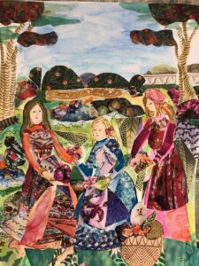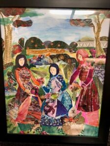 Sue Sherman remade her beautiful collages so that the bared arms and women’s hair in the art pieces are now covered to be appropriate for Afghanistan culture.